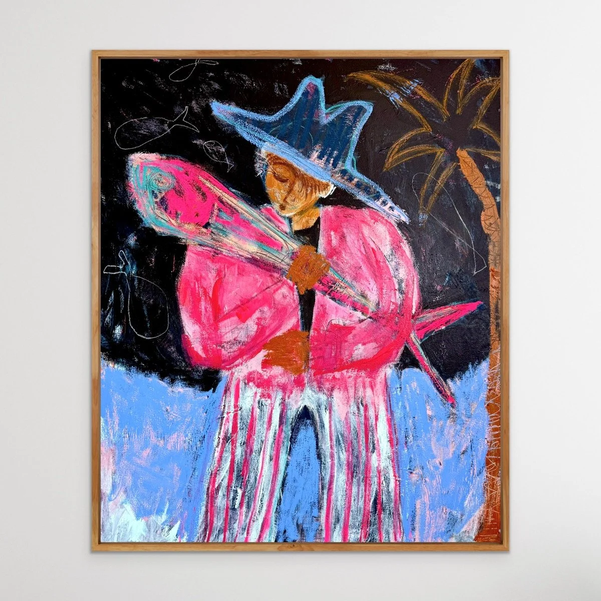 Drawing from years of experience as a graphic designer, Pav embraces colour, shape, and mixed media to build compositions that feel both immediate and considered. Her work often centres around the human figure… distorted, exaggerated, or simplified… placed in scenes that suggest a narrative without ever making it explicit. She is drawn to moments of contrast: stillness and movement, loud colour and negative space, humour and vulnerability.
